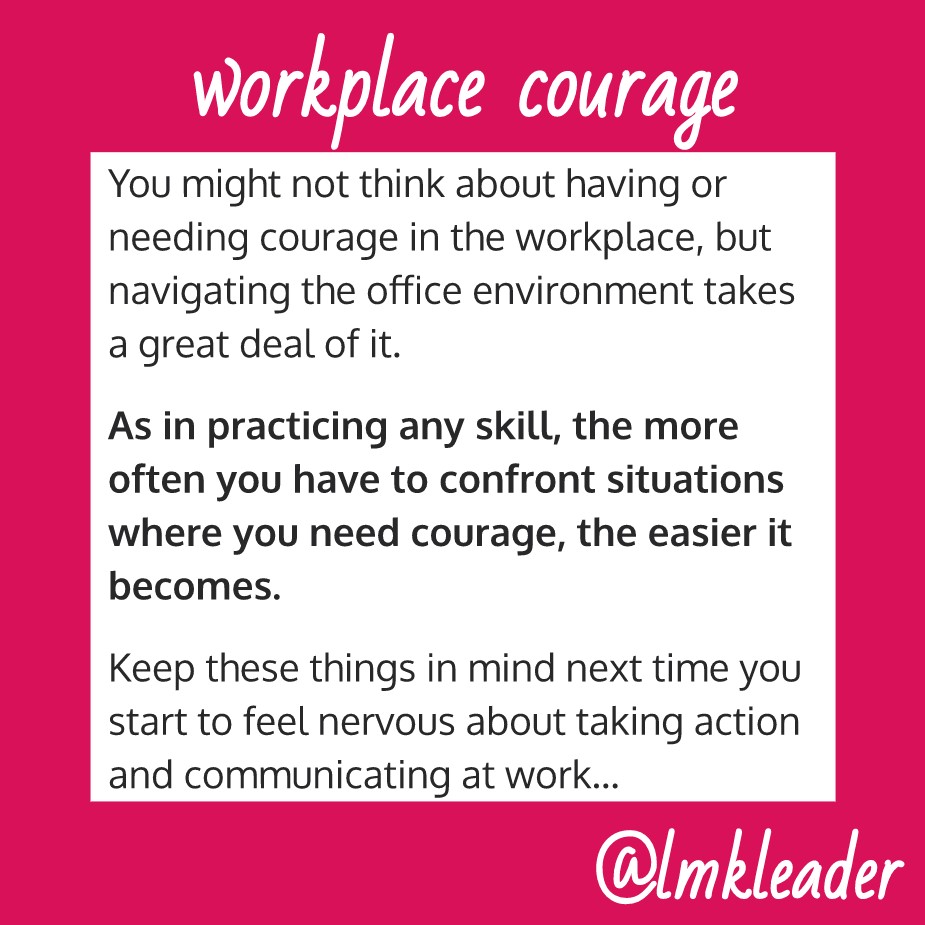 You might not think specifically about having courage in the workplace, but navigating the office environment takes a great deal of it. You’ll have to work with new people, ask for advice or help, escalate issues, deliver bad news, raise questions in large groups…the list goes on. For a lot of people, these kinds of interactions could be nerve-wracking. The online version of most interactions (texting, email) is becoming the preference compared to in-person interactions, especially post-pandemic. But that does not make some of these interactions that require courage much easier. Sometimes, even direct messaging someone you’ve never met before with a simple question can feel daunting! You can take comfort in this shared experience of work being awkward, and build courage along the way.