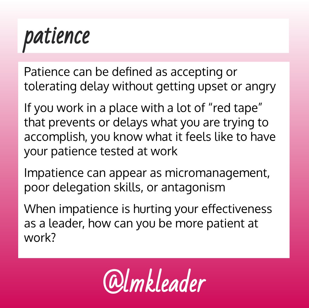 You have to be able to identify the moments where exhibiting patience can be a management and leadership strategy. Being patient can serve you better than losing patience and appearing rushed or hostile. In other words, when is impatience hurting your effectiveness as a leader, and how can you be more patient at work?