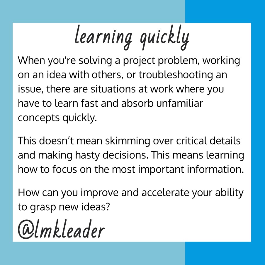The final step in learning quickly is to focus on understanding the information, not just memorizing it. This ties back to the first step in knowing your learning style. The intent is to learn, absorb, understand, comprehend. This is information you will be able to recall. If you are using this knowledge to make a decision today, you’ll be able to call back to explain the intent behind your decision later. You’ll also be able to use this newfound knowledge in the future.