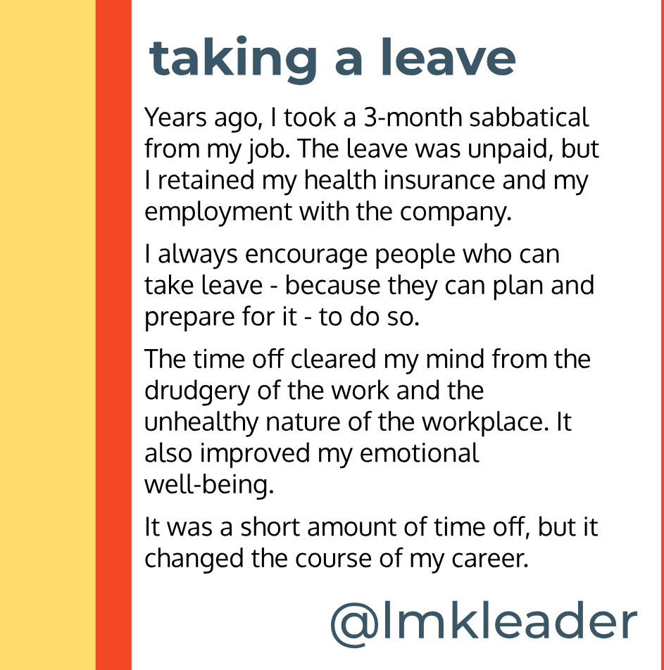 This article makes a compelling case for leave and the type of leave to consider based on your situation. Reading this article reminded me of my own experience.