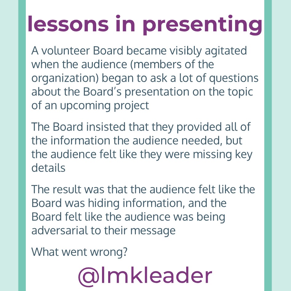 The Board presented a multimillion-dollar price tag to the Organization, with no knowledge shared with the Organization of what exactly that money was going to be spent on. Because the Board did not understand what the audience wanted to hear about in the meeting, they didn’t present the information that the audience wanted to hear.